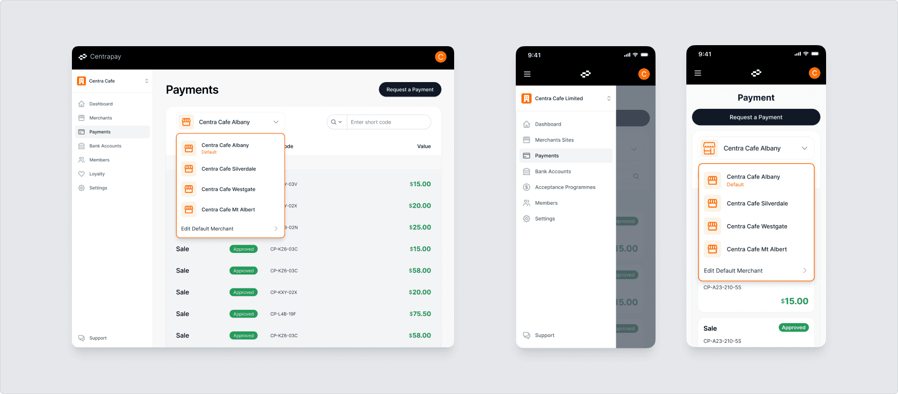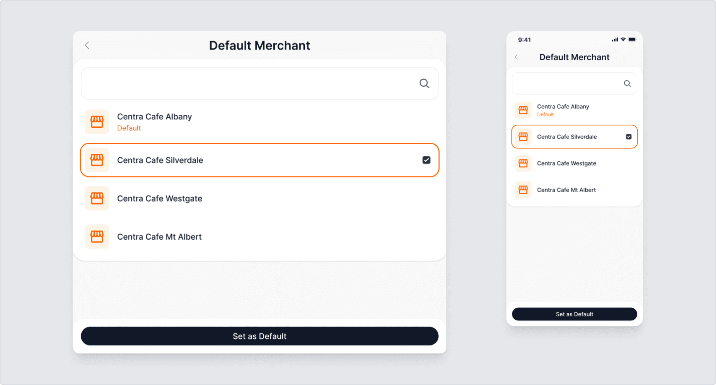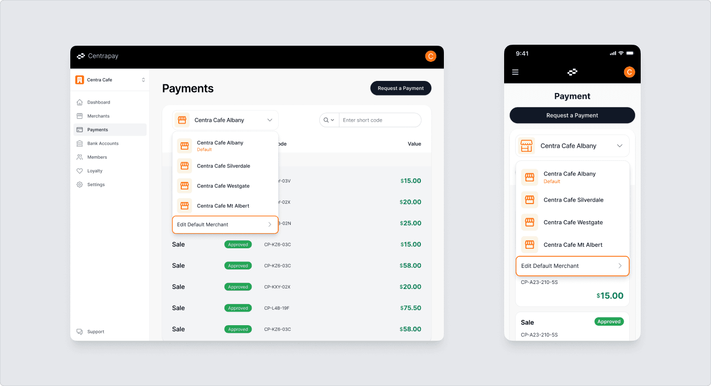 The default site is shown first on the Payments screen. To change it, select ‘edit default Merchant’, choose a site, and click ‘set as default’. To cancel, click the left arrow and confirm.